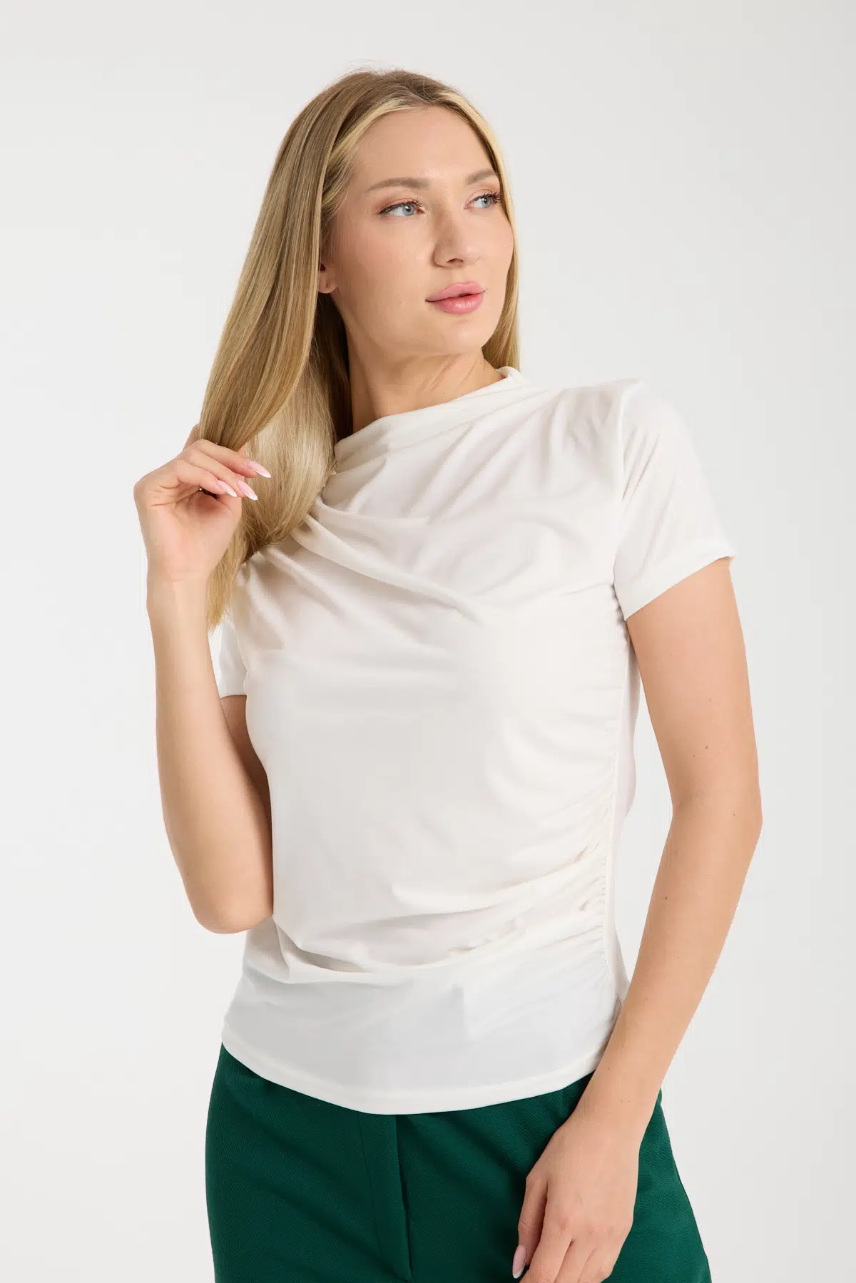 • Asimetrik büzgü detaylarıyla zarif ve modern bir siluet sunar.