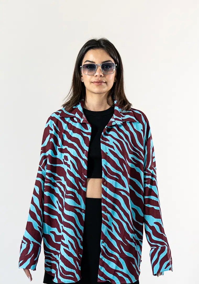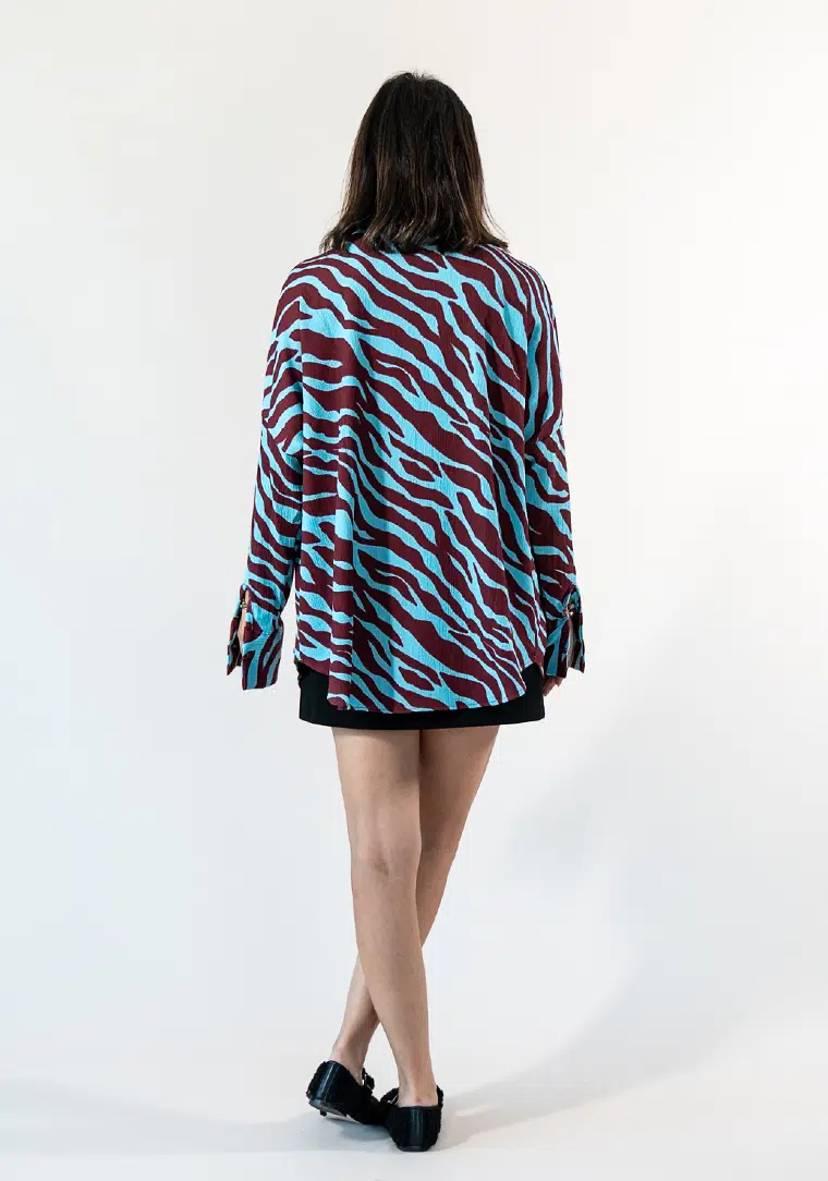 Mavi ve bordo zebra desenli tasarımıyla dikkat çeker.
