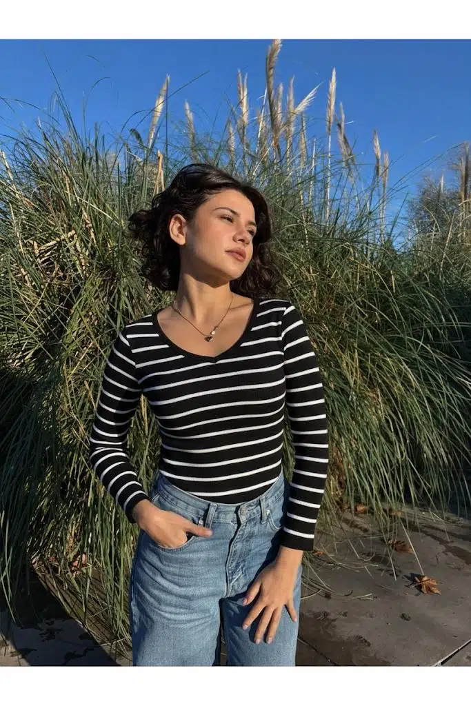Yumuşak dokulu çizgi desenli V yaka triko bluz, modern çizgileriyle hem günlük kombinlerde hem ofis şıklığında göz kamaştırır. Nefes alan esnek kumaşı sayesinde gün boyu konforlu bir kullanım sunar.