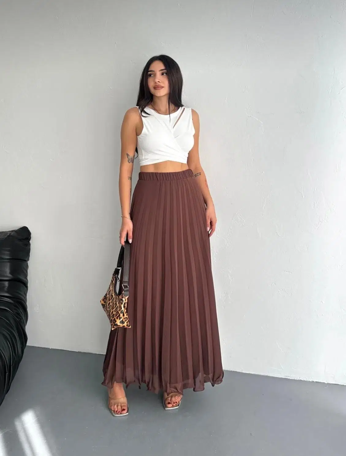 ➊ Kahverengi pileli tasarım etek, hafif ve dökümlü şifon kumaşıyla zarif bir duruş sergiler. ➋ Yüksek bel kesimi, beli ince göstererek vücut hatlarını ön plana çıkarır. ➌ Ürün uzunluk boyu : 100 cm'dir. ➍ Hareketle birlikte uçuşan pileler, eteğe dinamik ve feminen bir hava katar. ➎ Günlük kombinlerde ya da özel davetlerde rahatlıkla tercih edilebilecek şık bir parçadır.
