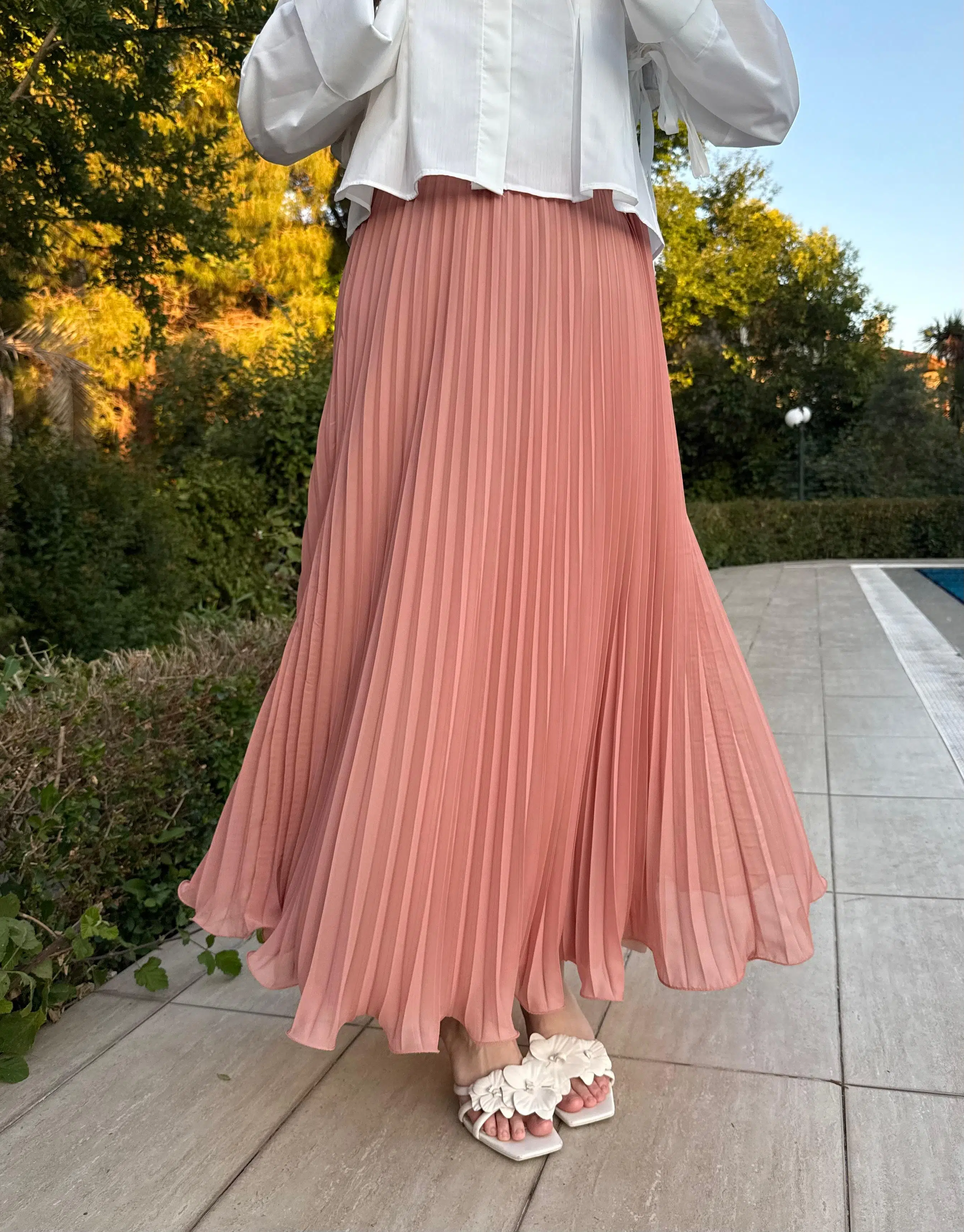 ➊ Pembe pileli tasarım etek, hafif ve dökümlü şifon kumaşıyla zarif bir duruş sergiler.