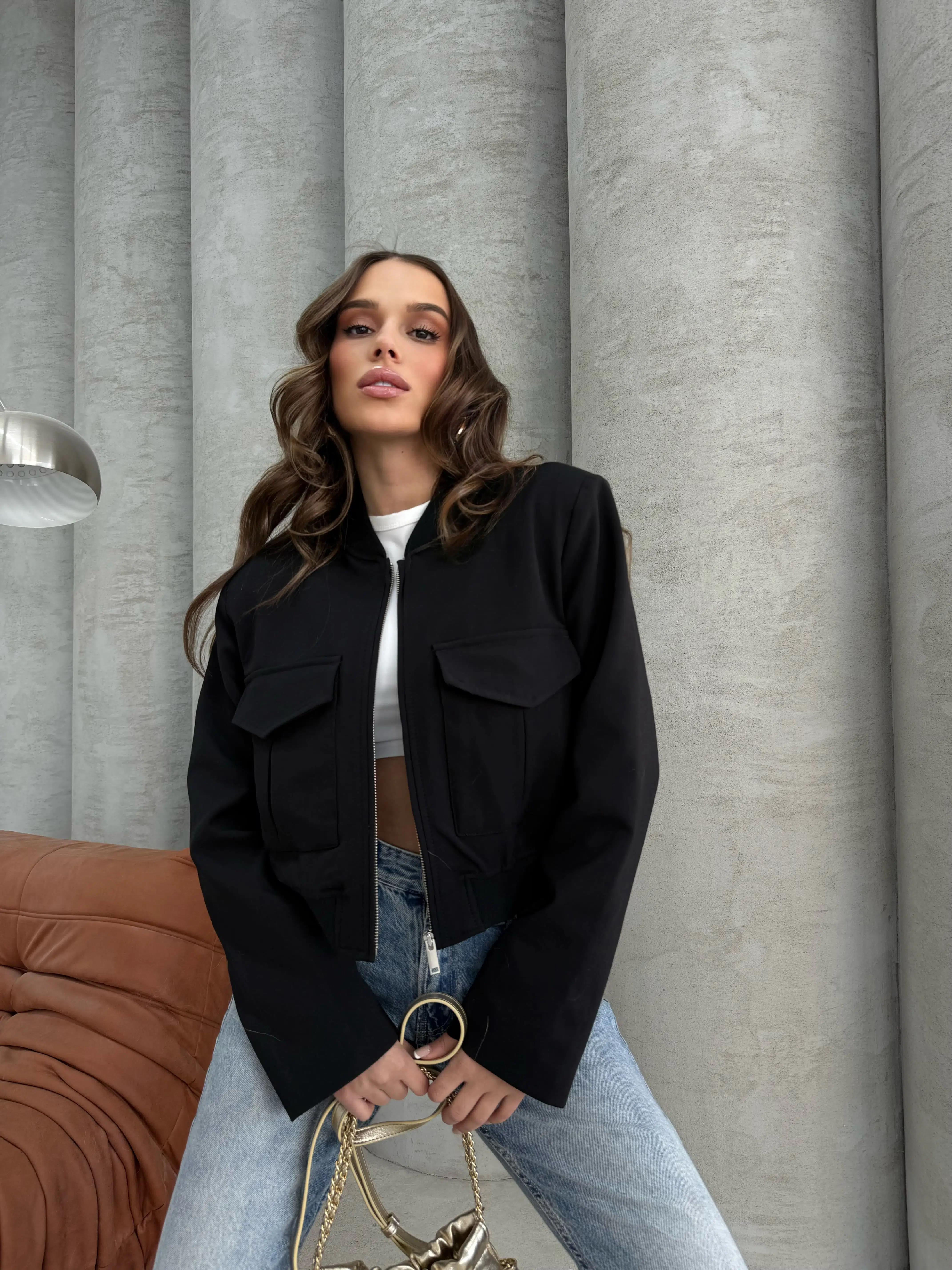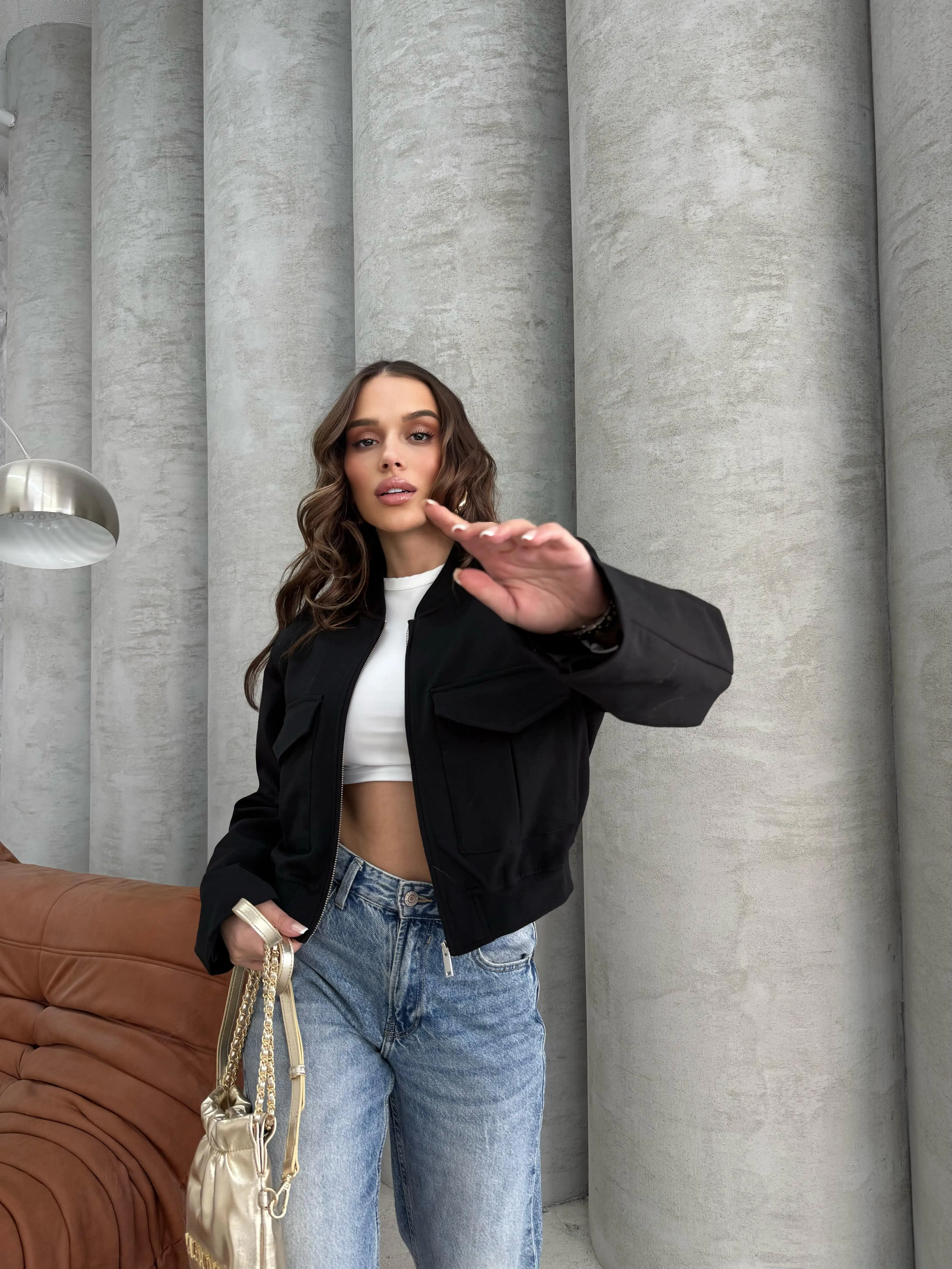 Siyah rengi, kısa ve bol kesimiyle modern bir siluet sunar.