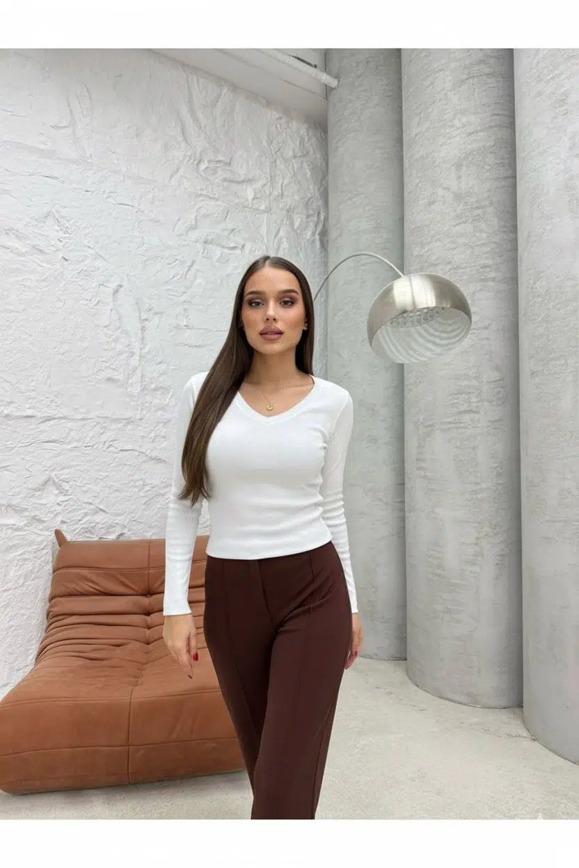 Yumuşak dokulu çizgi desenli V yaka triko bluz, modern çizgileriyle hem günlük kombinlerde hem ofis şıklığında göz kamaştırır. Nefes alan esnek kumaşı sayesinde gün boyu konforlu bir kullanım sunar. Kendi bedeninizi tercih edebilirsiniz, formunu koruyan triko yapısı vücudu zarifçe sarar ve şık bir siluet oluşturur.